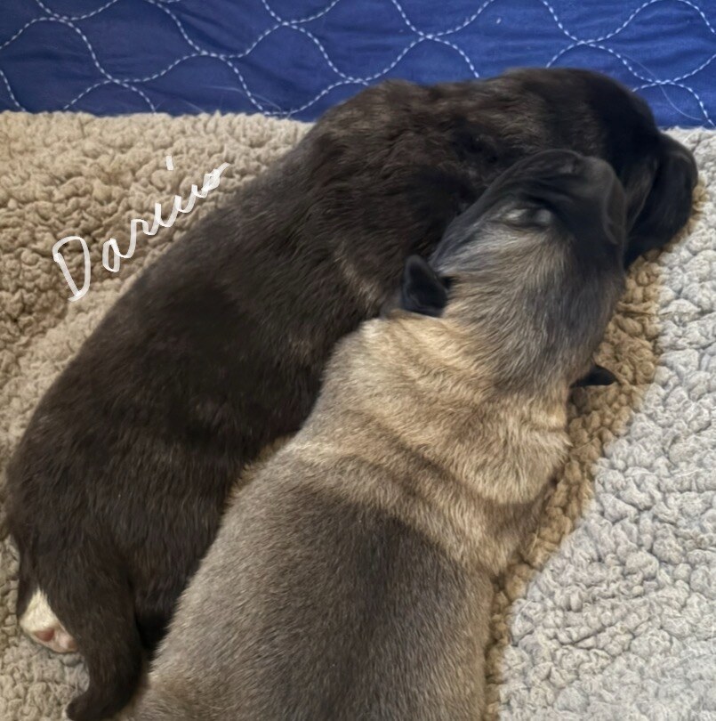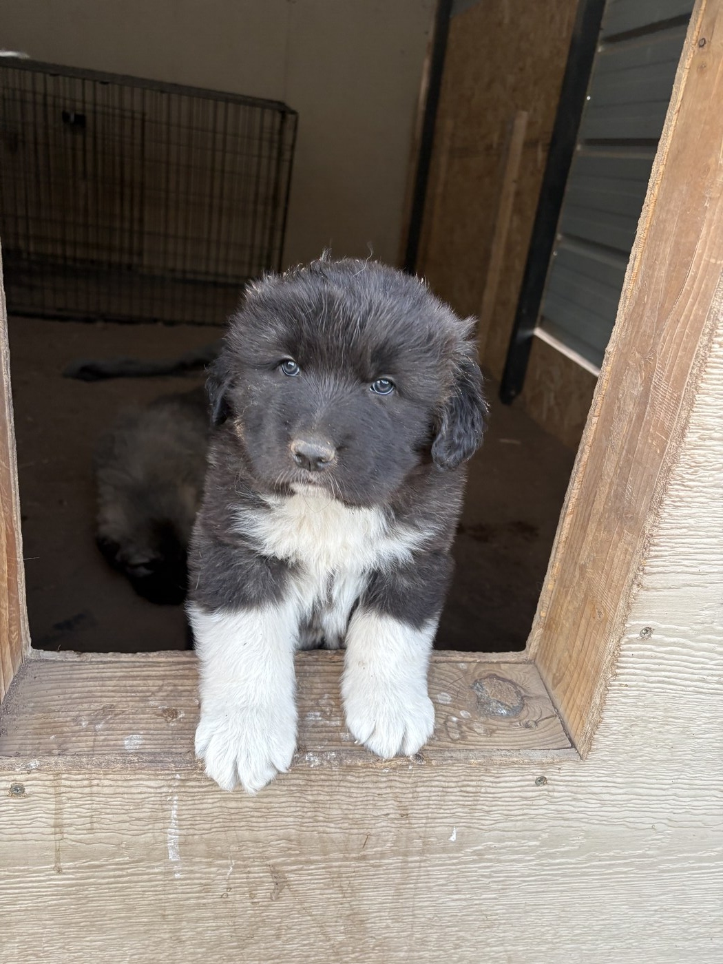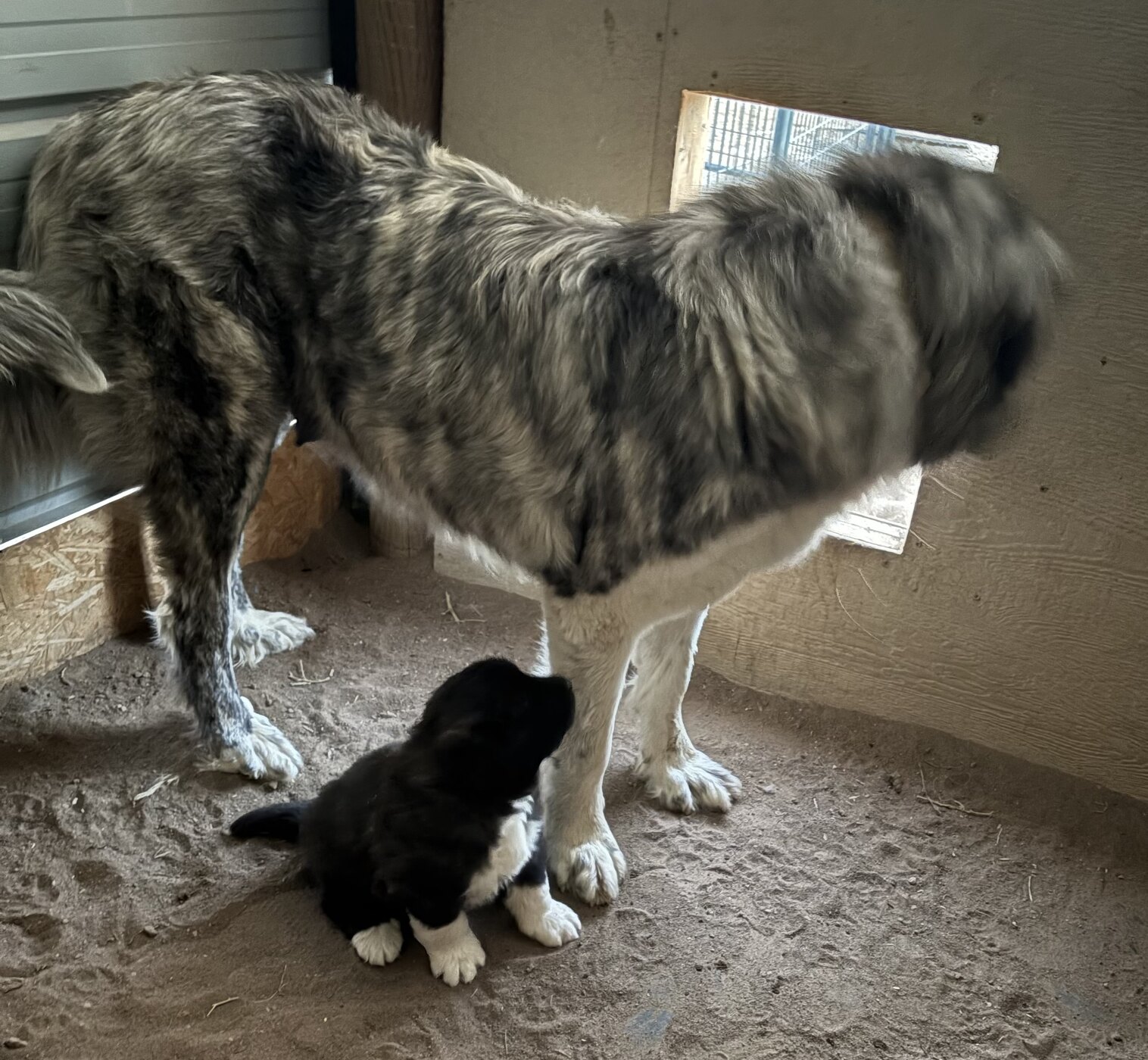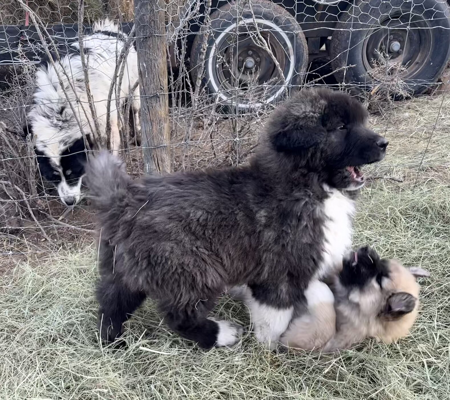 MBK Darius is a handsome masked brindle boy with white feet, like his mama!! He has double dews on one leg and single on the other. His breed breakdown is 56% GP, 19% Anatolian Shepherd, 13% Caucasian Shepherd Dog, 8% Boz Shepherd, and 4% Akbash. This boy should be quite large, his mama is 31" and dad is 30". He tested clean DNA with Wisdom.